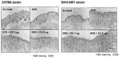도 28은 황색 포도상구균 유래 세포밖 소포체에 의한 아토피피부염 동물모델-테이프 스트리핑 동물모델에서 테이프 스트리핑과 함께 세포밖 소포체 (EV) 투여 시 상피세포층의 변화와 염증세포의 침윤 (화살표)를 보여주는 조직학적 소견이다.FIG. 28 shows histology showing changes in epithelial cell layer and infiltration of inflammatory cells upon administration of extracellular vesicles (EV) with tape stripping in atopic dermatitis animal model-tape stripping animal model by Staphylococcus aureus-derived extracellular vesicles. It is finding.