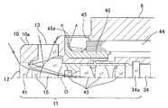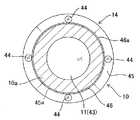 この出射端面が臨む位置には、その位置を中心として円筒部10の円筒形状の側面外周に沿って帯状に長く延び、光を導光する溝部としての導光溝45を形成する凹部45aが設けられている。凹部45a内に、出射端面に対面するように形成される照明反射部としての反射部材46を配置して、この反射部材46の内面に、光を反射する反射部46aを設けた導光溝45が形成される。Then, near the base end of the cylindrical portion 10 (the outer peripheral side of the rear lens group 43), the tip end face of thelight guide 44 is disposed near the side face, and the tip end face of thelight guide 44 emits light guided. It becomes an end face and emits light in the direction of the tip. In the present embodiment, the output end face is circular (see FIG. 3), but not limited to the circular shape, it may have an irregular shape including an oval or a polygon.