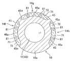 また本変形例では、1つの導光溝45内に複数のLED81を配置して、側視照明窓14f、14g、14hを形成している。FIG. 13 is a cross-sectional view showing a configuration of a side-view illumination unit in a second modified example of the third embodiment. In this modification, for example, in the three side-view illumination windows 14 shown in FIG. 8, a light emitting member using a light emitting diode (LED) 81 instead of the light guide 44 (formed of light guide fibers (bundles)) I have to. Further, in the present modification, thelight guide groove 45 is directly formed in thecylindrical member 10 a, and thereflection portion 46 a is provided on the inner surface of thelight guide groove 45. In this case, thelight guide groove 45 doubles as the function of the reflectingmember 46 having the reflectingportion 46a.
