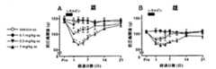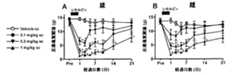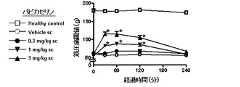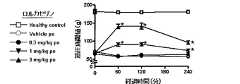全ての測定値は平均値±標準誤差として表記した。各時点における測定値の、被検薬物投与群と溶媒投与群の間の統計学的有意差検定は二元配置分散分析およびBonferroni法によって行なった。危険率(P) 5 %未満を統計学的有意と判定した(P <0.05を*として図中に表記した)。All measured values are expressed as mean ± standard error. The statistical significance test of the measured values at each time point between the test drug-administered group and the solvent-administered group was performed by two-way analysis of variance and Bonferroni method. A risk factor (P) of less than 5% was determined to be statistically significant (P * <0.05 was shown in the figure as *).