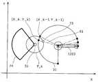 なお、ここでは、危険領域生成部1101は、動作計画部1201が保持する最後の回転角のみから扇形を決定したが、動作計画部1201が保持するk番目と(k-1)番目(ただし、k=1、2、・・・、n)の2つの回転角から、可動部1203の端の2つの位置と点A(AX、AY)で囲まれる扇形の領域を危険領域31として決定してもよい。また、危険領域生成部1101は、扇形の近似として、動作計画部1201が保持するk番目と(k-1)番目(ただし、k=1、2、・・・、n)の2つの回転角から、可動部1203の端の2つの位置と点A(AX、AY)で囲まれる三角形の領域を危険領域31として決定してもよい。Here, although the dangerous