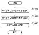また、本発明によるプログラムは、人の位置である人位置を取得する人位置取得ステップと、前記人位置取得ステップで取得された前記人位置に依存させて、前記人の視界範囲を決定する人視界範囲決定ステップと、動作計画に従って動作するロボットの少なくとも一部が前記視界範囲に含まれる特定時刻における前記ロボットの位置、および、前記特定時刻における前記ロボットの姿勢のうち少なくとも一方を含む位置姿勢を決定する位置姿勢決定ステップと、前記位置姿勢決定ステップで決定された前記位置姿勢を示すための画像データを生成する画像生成ステップとをコンピュータに実行させるためのプログラムであってもよい。The program according to the present invention includes a person position acquisition step for acquiring a person position, which is a person position, and a person who determines the person's view range depending on the person position acquired in the person position acquisition step. A view range determination step, and a position and orientation including at least one of the position of the robot at a specific time when at least a part of the robot operating according to the motion plan is included in the view range, and the posture of the robot at the specific time A program for causing a computer to execute a position and orientation determination step to be determined and an image generation step to generate image data for indicating the position and orientation determined in the position and orientation determination step.