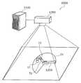 このように決定された危険領域31は、図1に示された表示装置1300によって表示される。表示装置1300は、ロボット1200が設置された部屋の天井に設置されたプロジェクタであって、人51がいる側、すなわち地面側に向かって危険領域31、および、後述の特徴姿勢を投影する。The
