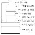 본 발명에 다른 실시예에 따른 유기전계발광소자의 구조는 도 1 내지 6에 예시되어 있으나, 이들 구조에만 한정된 것은 아니다. 이때, 도면번호 101은 기판, 102는 양극, 103는 정공주입층(HIL), 104는 정공수송층(HTL), 105는 발광층(EML), 106은 전자주입층(EIL), 107은 전자수송층(ETL), 108은 음극을 나타낸다. 미도시하였지만, 이러한 유기전계발광소자는 정공의 이동을 저지하는 정공저지층(HBL), 전자의 이동을 저지하는 전자저지층(EBL) 및 보호층이 더 위치할 수도 있다. 보호층의 경우 최상위층에서 유기물층을 보호하거나 음극을 보호하도록 형성될 수 있다.The structure of the organic light emitting display device according to another embodiment of the present invention is illustrated in FIGS. 1 to 6, but is not limited thereto. In this case, reference numeral 101 denotes a substrate, 102 an anode, 103 a hole injection layer (HIL), 104 a hole transport layer (HTL), 105 a light emitting layer (EML), 106 an electron injection layer (EIL), 107 an electron transport layer ( ETL), 108 represents a negative electrode. Although not shown, the organic light emitting diode may further include a hole blocking layer (HBL) for blocking the movement of holes, an electron blocking layer (EBL) for preventing the movement of electrons, and a protective layer. The protective layer may be formed to protect the organic material layer or the cathode at the uppermost layer.