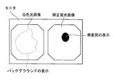 画像生成部41により生成された蛍光画像および白色光画像は画像補正部43に送られる。画像補正部43においては、蛍光画像が白色光画像で除算されることにより補正蛍光画像が生成される。生成された補正蛍光画像は、閾値設定部45に送られるとともに、図2Aに示すように、白色光画像と一緒にモニタ50に送られて表示される。The fluorescent image and white light image generated by theimage generation unit 41 are sent to theimage correction unit 43. In theimage correction unit 43, the corrected fluorescent image is generated by dividing the fluorescent image by the white light image. The generated corrected fluorescence image is sent to thethreshold setting unit 45 and, as shown in FIG. 2A, sent to themonitor 50 together with the white light image for display.