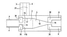 In the example in Fig. 7, the swirlingflow generating chamber 2, the narrowingchamber 3, the firstconduit pipe portion 4, the secondconduit pipe portion 5, and the thirdconduit pipe portion 6 are integrally made of the same member.  Thefirst inflow opening 14, the second inflow opening 15 and theoutflow opening 16 having a narrower inner diameter than that of the swirlingflow generating chamber 2 and the narrowingchamber 3 are required to have strength higher than that of the swirlingflow generating chamber 2 and the narrowingchamber 3.  In light of this, in the fourth embodiment of Fig. 19, the firstconduit pipe portion 4 having thefirst inflow opening 14, the secondconduit pipe portion 5 having the second inflow opening 15, and the thirdconduit pipe portion 6 having theoutflow opening 16 are made ofmembers 36, 37, and 38 respectively each independent from the swirlingflow generating chamber 2 and the narrowingchamber 3.