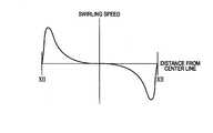 Fig. 12 schematically illustrates a swirling speed profile of a vortex in a cross section along line XII-XII of Fig. 10.  The vertical axis indicates the flow rate of the swirling flow and the value at the intersection point with the horizontal axis is 0.  This means that the farther away from the origin in the vertical direction, the higher the flow rate of the swirling flow becomes.  The horizontal axis indicates the distance from the center line of themixing device 1 and the intersection point with the vertical axis is on the center line of themixing device 1.  In short, this means that the farther away from the origin in the horizontal direction is, the farther away from the center line of themixing device 1 is.