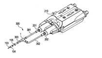 Fig. 2 is a perspective view of thehead 210 of the drugsolution injecting apparatus 200 and the mixingtube 300 of the drugsolution injecting system 100.  Each front end of thefirst syringe 201 and thesecond syringe 202 attached to thehead 210 has a conduit pipe portion.  The mixingtube 300 having the mixingdevice 1 of the present invention is connected to the conduit pipe portion.  Further, the mixingtube 300 is communicated with acatheter 103 through aflexible tube 105, a branch pipe (not shown), acatheter hub 104, and the like.  In Fig. 2, thefirst syringe 201 and thesecond syringe 202 are housed inside the protective syringe case.