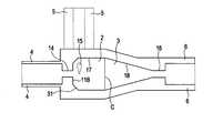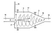 The secondconduit pipe portion 5 extends in a direction crossing the central axis line of the swirlingflow generating chamber 2.  Further, the swirlingflow generating chamber 2 is communicated with a large-diameter side opening 12 of the narrowingchamber 3 at a boundary C indicated by dotted lines in the figure.  The narrowingchamber 3 is communicated with theoutflow opening 16 through a small-diameter side opening 13.  In the present example, the secondconduit pipe portion 5 extends in a direction orthogonal to the central axis line of the swirlingflow generating chamber 2, but the secondconduit pipe portion 5 may extend in a direction inclined to the central axis line of the swirlingflow generating chamber 2.