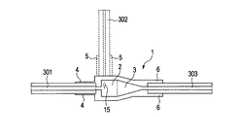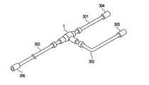 Thefirst tube 301 has afirst connection portion 304 connected to the conduit pipe portion at the front end of thefirst syringe 201.  Thesecond tube 302 has asecond connection portion 305 connected to the conduit pipe portion at the front end of thesecond syringe 202.  Thethird tube 303 has athird connection portion 306 connected to theflexible tube 105.  Thefirst connection portion 304, thesecond connection portion 305, and thethird connection portion 306 are connected by threaded connection, bonding, or the like.