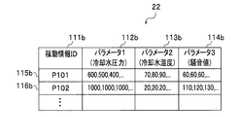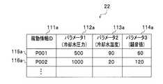 In theoperation information database 22 of FIG. 3, the cooling water pressure is stored in theparameter 1column 112a, the cooling water temperature is stored in the parameter 2column 113a, and the parameter 2 is associated with the operation information ID stored in the operationinformation ID column 111a. A noise value is stored in thecolumn 114a.