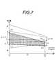 図6にて、縦軸のセンターが輻輳点の視差(=0)であり、本撮像装置では輻輳点の距離を2.0mに設定してある。この視差分布にて、縦軸のセンターよりも上側は、輻輳点よりも近い距離にある被写体の視差を示しており、縦軸のセンターよりも下側は、輻輳点よりも遠い距離にある被写体の視差を示している。視差分布の上辺は被写体距離が0.5m(MOD)である場合の視差変化を示し、下辺は無限遠距離の場合の視差変化を示している。6, the center of the vertical axis is the parallax (= 0) of the convergence point, and in this imaging apparatus, the distance of the convergence point is set to 2.0 m. In this parallax distribution, the upper side of the center of the vertical axis shows the parallax of the subject at a distance closer to the convergence point, and the lower side of the center of the vertical axis is the subject at a distance farther than the convergence point. The parallax is shown. The upper side of the parallax distribution shows the parallax change when the subject distance is 0.5 m (MOD), and the lower side shows the parallax change when the distance is infinity.