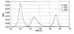 図3に、バックライト20における光源22R、22G、22Bの出射スペクトルを示す。上述したように、光源22R、22G、22Bのそれぞれの強度は制御可能であるが、ここでは、光源22R、22G、22Bのそれぞれの強度を最高にしたときの出射スペクトルを示している。光源22Rの出射スペクトルのピーク波長は約450nmであり、光源22Gの出射スペクトルのピーク波長は約520nmであり、光源22Bの出射スペクトルのピーク波長は約630nmである。FIG. 3 shows emission spectra of the