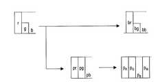 このような階調レベルpr、pg、pbは3原色液晶パネルの赤、緑および青サブ画素の階調レベルに相当しており、階調レベルpr、pg、pbの液晶データ信号が3原色液晶パネルに入力されると、この液晶パネルにおける赤、緑および青サブ画素の液晶層は階調レベルpr、pg、pbに対応する透過率を示す。本明細書の以下の説明において、3原色液晶パネルの赤、緑および青サブ画素のそれぞれにおいて最低値をゼロ(0)、最高値を1とするように規格化した透過率を透過率レベルと表す。すなわち、透過率レベル0は3原色液晶パネルにおける赤、緑および青サブ画素のそれぞれの透過率の最低値に相当し、透過率レベル1は3原色液晶パネルにおける赤、緑および青サブ画素のそれぞれの透過率の最高値に相当する。なお、階調レベルpr、pg、pbは輝度(または出射光強度)に対して非線形であるのに対して、透過率レベルpr、pg、pbは輝度(または出射光強度)に対して線形である。Such gradation levels pr, pg, and pb correspond to the gradation levels of the red, green, and blue sub-pixels of the three primary color liquid crystal panels, and the liquid crystal data signals of the gradation levels pr, pg, and pb are the three primary color liquid crystals. When input to the panel, the liquid crystal layers of the red, green, and blue sub-pixels in this liquid crystal panel exhibit transmittances corresponding to the gradation levels pr, pg, and pb. In the following description of the present specification, the transmittance that is normalized so that the lowest value is zero (0) and the highest value is 1 in each of the red, green, and blue sub-pixels of the three primary color liquid crystal panels is referred to as a transmittance level. To express. That is, the