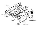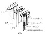 例えば図1Cは、核酸やタンパク質などの生体関連物質その他の被検試料を、磁性粒子を利用して抽出する際に使われるチップを備えたカートリッジである。図1Cにおいて、(a1)はカートリッジのチップを1枚のシールで被覆した態様を示す図であり、(b1)は被覆シールを剥がした図、(c1)は収容部に収容されたチップを示す断面図である。カートリッジのチャンバに収容されたチップは、左側から磁性粒子による処理用の長チップ、試料処理用の短チップ、試料抽出用の短チップ、そしてシール破砕ツールを備えている。シール破砕ツールは、チップの開口を密封した密閉シール(例えばラミネートシール)を破砕するためのツールである。シールを剥がして識別子が露出すると、識別子の読み取り機構により、識別子に記録された情報が読み取られ、ピペットチップを備えたノズルによりハンドリングが開始される。なお、磁性粒子による処理用のチップは、例えばWO99/47267号公報、WO2008/088065号公報、特許第3115501号公報などに記載されている。For example, FIG. 1C is a cartridge including a chip used when a biological sample such as nucleic acid or protein or other test sample is extracted using magnetic particles. In FIG. 1C, (a1) is a view showing a mode in which the chip of the cartridge is covered with one seal, (b1) is a view in which the cover seal is removed, and (c1) is a chip accommodated in the accommodating portion. It is sectional drawing. The chip housed in the chamber of the cartridge includes a long chip for processing with magnetic particles, a short chip for sample processing, a short chip for sample extraction, and a seal crushing tool from the left side. The seal crushing tool is a tool for crushing a hermetic seal (for example, a laminate seal) in which the opening of the chip is sealed. When the seal is peeled off and the identifier is exposed, the information recorded in the identifier is read by the identifier reading mechanism, and handling is started by the nozzle provided with the pipette tip. Note that chips for processing with magnetic particles are described in, for example, WO99 / 47267, WO2008 / 088065, and Patent 3115501.
