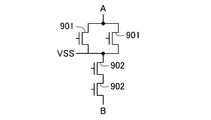 図8は従来の半導体装置の構成例を示す図であり、(a)~(c)はレイアウト平面図、(d)は(a)の線Y81-Y81’における断面図、(e)は(b)の線Y82-Y82’における断面図である。図8の構成は図9の回路図を実現したものである。図9では、電源配線VSSと端子Aとの間に2個のNMOSトランジスタ901が並列接続されており、また、電源配線VSSと端子Bとの間に2個のNMOSトランジスタ902が直列接続されている。図8(a)~(c)において、電源配線VSSの図面上側にある2個のトランジスタがNMOSトランジスタ901に相当し、図面下側にある2個のトランジスタがNMOSトランジスタ902に相当する。。FIG. 8 is a diagram showing a configuration example of a conventional semiconductor device, in which (a) to (c) are layout plan views, (d) is a sectional view taken along line Y81-Y81 ′ in (a), and (e) is ( FIG. 6B is a cross-sectional view taken along line Y82-Y82 ′ of b). The configuration of FIG. 8 realizes the circuit diagram of FIG. In FIG. 9, two