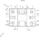 半導体チップ25は、Siなどの半導体材料からなり、内部には微細回路が作りこまれている。半導体チップ25は、z方向において互いに反対を向く底面25aおよび表面25bを有しており、底面25aは表面25bよりも図19中下方に位置している。図18に示す例では、半導体チップ25はz方向視において半導体チップ24よりも小さな正方形となっている。半導体チップ25の底面25aは固定部材35を介して半導体チップ24の表面24bに固定されている。半導体チップ25の表面25bには8個の電極端子251が設けられている。図18に示す例では、8個の電極端子251は、x方向視あるいはy方向視において、8個の電極端子241と重ならない位置に配置されている。各電極端子251は、半導体チップ25内の微細回路に接続されている。なお、電極端子251の個数は半導体チップ25の機能に応じて適宜変更され得るものである。Thesemiconductor chip 25 is made of a semiconductor material such as Si, and a fine circuit is formed inside. Thesemiconductor chip 25 has abottom surface 25a and asurface 25b that are opposite to each other in the z direction, and thebottom surface 25a is located below thesurface 25b in FIG. In the example shown in FIG. 18, thesemiconductor chip 25 is a square smaller than thesemiconductor chip 24 when viewed in the z direction. Thebottom surface 25 a of thesemiconductor chip 25 is fixed to thesurface 24 b of thesemiconductor chip 24 through a fixingmember 35. Eightelectrode terminals 251 are provided on thesurface 25 b of thesemiconductor chip 25. In the example illustrated in FIG. 18, the eightelectrode terminals 251 are arranged at positions that do not overlap the eightelectrode terminals 241 when viewed in the x direction or the y direction. Eachelectrode terminal 251 is connected to a fine circuit in thesemiconductor chip 25. The number ofelectrode terminals 251 can be changed as appropriate according to the function of thesemiconductor chip 25.