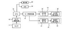 モータ制御回路15は、水平用モータ31の駆動を指示する旨の制御信号である水平駆動制御信号をCPU16から受信すると、水平用モータ31を駆動させ、垂直用モータ41の駆動を指示する旨の制御信号である垂直駆動制御信号をCPU16から受信すると、垂直用モータ41を駆動させる。When themotor control circuit 15 receives a horizontal drive control signal, which is a control signal for instructing driving of thehorizontal motor 31, from theCPU 16, themotor control circuit 15 drives thehorizontal motor 31 and instructs to drive thevertical motor 41. When a vertical drive control signal, which is a control signal, is received from theCPU 16, thevertical motor 41 is driven.