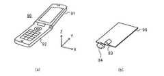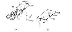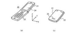 図6(a)は図5に示した携帯端末10の外観を示す斜視図である。携帯端末10は、蓋部21と本体部22からなる折り畳み式の携帯電話機であり、図6(a)は蓋部21を開いた状態である。ここでは、携帯端末10の本体部22が水平になるように、図6(a)に示す状態で机の上に置かれているものとし、長方形状の本体部22の短辺方向をX軸方向とし、長辺方向をY軸方向とすると、本体部22の操作面はZ軸方向と垂直になる。本実施形態では、図6(a)に示すように、携帯端末10の蓋部21が開いた状態で説明するが、蓋部21が閉じた状態であってもよい。FIG. 6A is a perspective view showing an appearance of themobile terminal 10 shown in FIG. Themobile terminal 10 is a foldable mobile phone including alid portion 21 and amain body portion 22, and FIG. 6A shows a state where thelid portion 21 is opened. Here, it is assumed that themain body portion 22 of themobile terminal 10 is placed on a desk in the state shown in FIG. 6A so that themain body portion 22 is horizontal, and the short side direction of the rectangularmain body portion 22 is the X axis. Direction, and the long side direction is the Y-axis direction, the operation surface of themain body 22 is perpendicular to the Z-axis direction. In the present embodiment, as illustrated in FIG. 6A, thecover 21 of themobile terminal 10 is described as being open, but thecover 21 may be closed.
