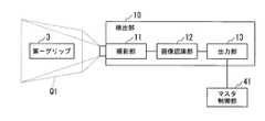 出力部13は、画像認識部12において取得された各マーカー5、9の座標を、マスタ制御部41へと座標情報として出力するとともに、認識された入力部の種類を出力する。本実施形態において出力部13から出力される座標情報は、第一グリップ3の本体部4の位置及び姿勢を特定するための情報(第一情報)、及び可動部6の操作入力状態を特定するための情報(第二情報)とを含んでいる。出力部13からは、第一グリップ3が視野Q1内で移動しているか否かに関わらず、所定の発信タイミングに従って座標情報が出力される。Theimage recognition unit 12 distinguishes and recognizes thefirst marker 5 and thesecond marker 9 from the captured image by a known image recognition process, and acquires the coordinates of thefirst marker 5 and thesecond marker 9. Further, the type of the input unit used is discriminated and recognized by identifying the marker or the like.