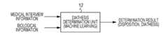 Fig.5 is a diagram schematically illustrating a diathesis determination method based on the biological information and the medical interview information inthediathesis determination unit 12.  In the diathesis determination method, determination functions f (disposition) and f (diathesis) are produced in advance from a large amount of medical interview data (including the biological information) through a machine learning technique.  Then, the determination function f (disposition) is input to adisposition determination unit 12a and the determination function f (diathesis) is input to a diathesi sdetermination unit 12b.