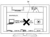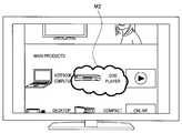The reproducingunit 210 can change a reproduction state, on the basis of operation information supplied from the operationinformation acquiring unit 215.  For example, as illustrated in Fig. 12, the reproducingunit 210 can scroll the display region of the content, on the basis of operation information input by aremote controller 22.  At this time, the reproducingunit 210 can change the position of the mark M, such that the mark M showing the point of interest overlaps the object shown by the point of interest.  In this example, the point of interest is designated on an image of a DVD player.  The point of interest information includes the information to specify the image object.  For this reason, even when the arrangement of the image object changes, the mark M can be displayed on the image object, according to the change in the arrangement of the image object.  Likewise, as illustrated in Fig. 13, the reproducingunit 210 can enlarge or reduce content and display the content, on the basis of operation information input by theremote controller 22.  Even in this case, the reproducingunit 210 can change the position of the mark M, such that the mark showing the point of interest overlaps the same object.