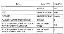 First, referring to Fig. 6, an example of point of interest information when a point of interest is designated on a still image object in HTML content is illustrated.  In this case, the point of interest information can include an ID, a type, a file name, a place of a file name tag from the top, a relative position of a point of interest in an image in a horizontal direction, and a relative position of a point of interest in an image in a vertical direction.  The ID is identification information used to identify a point of interest and a data type thereof may be an integer type.  The type shows a type of each object and a data type thereof may be a character string type.  The file name shows a file name of each object and a data type thereof may be a character string type.  The place of the file name tag from the top is information used to specify each object when there are a plurality of objects having the same file names in content and shows a place from the top in the content.  A data type of a place of the file name tag from the top may be an integer type.  The relative position of the point of interest in the image in the horizontal direction and the relative position of the point of interest in the image in the vertical direction are information used to specify the detailed position of the point of interest in the specified object and data types thereof may be floating-point number types.