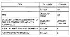 Next, referring to Fig. 8, an example of point of interest information when a point of interest is designated on a text object in HTML content is illustrated.  In this case, the point of interest information can include an ID, a type, a character string included in a point of interest and points before and after the point of interest, a place of a character string from the top, and a position in the character string.  The ID is identification information used to identify the point of interest and a data type thereof may be an integer type.  The type shows a type of each object and a data type thereof may be a character string type.  The character string included in the point of interest and the points before and after the point of interest shows a character string that is displayed in the vicinity of the position of the point of interest.  The place of the character string from the top is used to specify each character string when there are a plurality of character strings equal to each other in the same content.  In the example of Fig. 8, the place of the character string from the top is information showing what number "notebook computer" it is.  The position in the character string is information showing what number character in the character string the position of the point of interest in the character string is and a data type thereof may be an integer type.  In the example of Fig. 8, because the position in the character string shows the fifth character in the "notebook computer", the position of "b" is the point of interest.