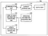The reproducingunit 210 has a function of reproducing content.  The reproducingunit 210 is an example of a display control unit that controls display of theoutput unit 220 functioning as a display unit.  For example, the reproducingunit 210 can reproduce the received content and the point of interest.  For example, as illustrated in Fig. 10, the reproducingunit 210 can reproduce the point of interest by overlapping a mark M1 showing the point of interest to the HTML content.  The reproducingunit 210 can reproduce the content and the point of interest, such that the center of the mark M1 becomes the position of the point of interest.  When the point of interest is shown, exactly, when the user desires to show a specific point, the mark M1 illustrated in Fig. 10 may be used.  Alternatively, when the user desires to show a rough position of the point of interest, a mark M2 illustrated in Fig. 11 may be used.  At this time, the reproducingunit 210 may display the mark M2, such that the center of gravity of the mark M2 becomes the point of the point of interest.  The reproducingunit 210 can provide the reproduced content and point of interest to the user by theoutput unit 220.
