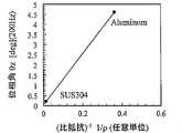 Is represented by Also, the inducedmagnetic field Hed 251 is proportional to the magnitude Je of the eddy current. From the above, the following equation is obtained.  (数11)は、渦電流による測定角度の角度ズレ(位相角)θzが導体のシート抵抗に反比例することを示す。したがって、角度ズレは、導体の比抵抗(抵抗率)ρに反比例し、有効板厚teに比例する。 (Equation 11) shows that the angular deviation (phase angle) θz of the measurement angle due to the eddy current is inversely proportional to the sheet resistance of the conductor. Therefore, the angular deviation is inversely proportional to the specific resistance (resistivity) 導体 of the conductor and proportional to the effective plate thickness te.  次に、この点を実験データにより検証する。図11は、前面導体としてアルミニウムとステンレンス(SUS304)とを用いた場合の、回転速度200Hzでの角度ズレ量θzを比較したものである。横軸は、それぞれの材料の比抵抗ρの逆数を用いている。角度ズレ量は材料の比抵抗の逆数1/ρに比例している。すなわち、比抵抗ρに反比例している。