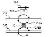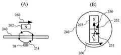 図8(A)の側面図において、磁束発生体であるセンサ磁石202が矢印260の方向に移動すると、非磁性の導体240と鎖交する磁束が変化するため、非磁性の導体240中にはその磁束変化を打ち消す方向の渦電流が流れる。この渦電流は誘起磁界251を誘起する。誘起磁界251の方向は図8(A)に示した通り、導体に鎖交する磁束の変化を打ち消す方向である。In the side view of FIG. 8A, when thesensor magnet 202, which is a magnetic flux generator, moves in the direction of thearrow 260, the magnetic flux interlinked with thenonmagnetic conductor 240 changes. An eddy current flows in the direction to cancel the change in the magnetic flux. This eddy current induces an inducedmagnetic field 251. As shown in FIG. 8A, the direction of the inducedmagnetic field 251 is a direction that cancels out the change of the magnetic flux linked to the conductor.