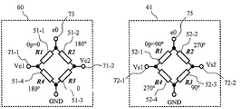 It becomes.  したがって、接地端子(図ではGNDと表記)を0Vとして励起端子75に励起電圧e0を印加すると、信号端子Vc1(71-1)とVc2(71-2)との電圧差は(数4)の通りになる。