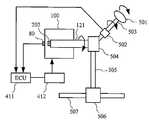 回転体121はモータ100の回転軸であり、一方の端にセンサ磁石202が設置されている。センサ磁石202の近傍には磁界角計測装置80が設置されており、回転体121の回転角を計測してECU411に送信する。Therotating body 121 is a rotating shaft of themotor 100, and thesensor magnet 202 is installed at one end. A magnetic fieldangle measurement device 80 is installed in the vicinity of thesensor magnet 202, and measures the rotation angle of therotating body 121 and transmits it to theECU 411.