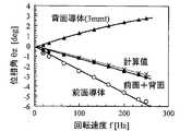 図7に示した中空の三角形(△)のデータは、非磁性の導体の材料としてアルミニウム板(板厚1mm)を背面導体として用いた場合、すなわち、センサ磁石202、磁気センサ70、導体の順に配置した場合の回転速度に対する位相角(角度ズレ)θzを示す。ここでは、回転速度が高速になると、角度ズレθzが正の方向に大きくなることが示されている。