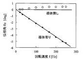 図6は回転体121の回転速度 f [Hz]を変えたときの位相角θz[deg] (degはdegree (度)の略)の変化を測定した結果である。図中で○は、磁気センサ202の近傍に導体が無い場合の結果である。回転速度を0~250[Hz]の範囲で変化させても位相角θzは一定である。すなわち、250[Hz]、すなわち、15000 [rpm](毎分当たりの回転数)の高速回転時においても、磁界角計測装置80は正しい回転角を出力している。FIG. 6 shows the results of measurement of the change in phase angle θz [deg] (where deg is an abbreviation of degree) when the rotational speed f [Hz] of therotating body 121 is changed. In the drawing, ○ indicates the result when no conductor is present in the vicinity of themagnetic sensor 202. Even if the rotational speed is changed in the range of 0 to 250 Hz, the phase angle θz is constant. That is, the magnetic fieldangle measurement device 80 outputs the correct rotation angle even at high speed rotation of 250 Hz, that is, 15000 rpm (rotational speed per minute).