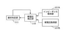 このように取得された眼電位の周波数にあわせてインピーダンス計測を行う際の周波数を決定することで、疲労判定に用いる眼電位を補正するインピーダンスを、対象信号である眼電位の周波数で計測することができる。よって、周波数の違いによるインピーダンスの差による眼電位の補正誤差を小さくして、より精度の高い眼球の疲労判定を行うことができる。By measuring the impedance at the time of performing impedance measurement according to the frequency of the electrooculogram acquired in this way, the impedance for correcting the electrooculogram used for fatigue determination is measured at the frequency of the electrooculogram that is the target signal. Can do. Therefore, the ocular potential correction error due to the impedance difference due to the frequency difference can be reduced, and the eyeball fatigue can be determined with higher accuracy.