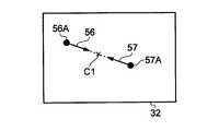 Fig. 5C illustrates another possible multi-touch operation, sometimes referred to as pinch in. Starting frompoints 56A and 57A, the twopaths 56 and 57 are substantially along the same direction and move towards each other. This can be used to encode a zoom out operation. For example, the centre C1 may be estimated based onpoint 56A,point 57A, the path directions, and/or the speed along the paths, and the zoom out operation may be centred on point C1.
