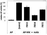 図21に示す通り、AP-MKのみを添加したウェルと比較して、ヒト型化FB54(hFB54)を添加したウェルでは、APの活性が81.8%に低下していた。FB54の親和性向上抗体を添加したウェルでは、mFB54-002、mFB54-089、hFB54-014、hFB54-020、hFB54-024、hFB54-039、hFB54-054、hFB54-062、hFB54-072で、それぞれAPの活性が18.9%、20.0%、25.6%、26.8%、22.7%、30.1%、33.5%、28.3%、33.0%に低下していた。コントロール抗体を添加したウェルでは、AP活性の低下がみられなかった。このことより、親和性向上抗体がオリジナルの抗体よりさらに強力な中和活性を有することが確かめられた。As shown in FIG. 21, the activity of AP was reduced to 81.8% in the well to which humanized FB54 (hFB54) was added, compared to the well to which only AP-MK was added. In the wells to which the affinity enhancing antibody of FB54 was added, mFB54-002, mFB54-089, hFB54-014, hFB54-020, hFB54-024, hFB54-039, hFB54-054, hFB54-062, and hFB54-072, respectively. AP activity decreased to 18.9%, 20.0%, 25.6%, 26.8%, 22.7%, 30.1%, 33.5%, 28.3%, 33.0% Was. In the wells to which the control antibody was added, no decrease in AP activity was observed. From this, it was confirmed that the affinity-enhancing antibody has a stronger neutralizing activity than the original antibody.