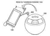 When the user brings themobile device 100 close to theaudio device 300, the NFC tag of theaudio device 300 is activated by the activation information. Then, the NFC tag transmits the NFC information, which includes address information for wireless communication, to themobile device 100. On the other hand, the power supply of theaudio device 300 is turned on in accordance with the activation of the NFC tag. Themobile device 100 recognizes the address of theaudio device 300 by extracting the address information from the NFC information.
