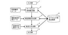 Generation of a conversation sentence when user attributes, agent attributes, and dynamic attributes as shown in Tables 11, 12, and 13 are given as inputs will be described. First, the agentstate estimation unit 2 refers to the agent state estimation rule as shown in Table 14, and the “status” of the agent state is set to “answering machine” and “emotion” by inputting the dynamic attribute “mail = slow”. Is estimated to be “lonely”.