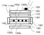 図8において、上部がタッチ面、ディスプレイの視認側になる。態様3では、タッチセンサ板160が偏光板100の外側に挿入されている。上部より押印された力により、タッチセンサ板160、カラーフィルタ基板110、アレイ基板130のそれぞれの裏面、それぞれ160b、110b、130bには引張応力が発生する。そのためこの面に化学強化による圧縮応力がかかっていると、パネルの強度向上に大きな効果がある。In Fig. 8, the upper part is the touch surface and the viewing side of the display. Inaspect 3, thetouch sensor plate 160 is inserted outside thepolarizing plate 100. Due to the force stamped from above, tensile stresses are generated on the back surfaces of thetouch sensor plate 160, thecolor filter substrate 110, and thearray substrate 130, respectively 160b, 110b, and 130b. Therefore, if a compressive stress is applied to this surface due to chemical strengthening, there is a great effect in improving the panel strength.