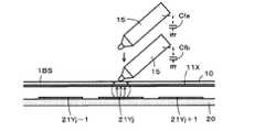 先ず、上述の第1の製造方法と同様に、第1の導体11Xを形成した上側基板10と、第2の導体21Yを形成した下側基板20とを、第1の導体11Xと第2の導体21Yとが互いに直交するような状態で、かつ、上側基板10の第1の導体11Xが形成されている面と、下側基板20の第2の導体21Yが形成されている面とを、前述した所定の距離dだけ離間させて対向させる(図21(A)参照)。First, similarly to the first manufacturing method described above, theupper substrate 10 on which thefirst conductor 11X is formed and thelower substrate 20 on which thesecond conductor 21Y is formed are combined with thefirst conductor 11X and thesecond conductor 11X. The surface of theupper substrate 10 where thefirst conductor 11X is formed and the surface of thelower substrate 20 where thesecond conductor 21Y is formed, such that theconductor 21Y is orthogonal to each other. The above-mentioned predetermined distance d is spaced apart from each other (see FIG. 21A).