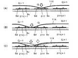 このため、上述の(式1)から明らかなように、当該押圧力が印加された部位の第1の導体11Xと下側基板20の第2の導体21Yとで形成されるコンデンサの静電容量が大きくなる。この場合に、指示体により押圧力が印加されている指示位置の座標は、この例では、いわゆる3点方式により検出される。すなわち、図5(A)においては、第1の導体11Xが撓むことにより、この第1の導体11Xと対向する3本の第2の導体21Yj-1,21Yj,21Yj+1との間の距離が変化して、第1の導体11Xと、第2の導体21Yj-1,21Yj,21Yj+1とで間で構成されるコンデンサのそれぞれの静電容量Cj-1,Cj,Cj+1が変化する。For this reason, as is clear from the above (Formula 1), the capacitance of the capacitor formed by thefirst conductor 11X at the portion where the pressing force is applied and thesecond conductor 21Y of thelower substrate 20 Becomes larger. In this case, the coordinates of the indicated position to which the pressing force is applied by the indicator are detected by a so-called three-point method in this example. That is, in FIG. 5A, thefirst conductor 11X bends, so that the distance between the three second conductors 21Yj-1, 21Yj, and 21Yj + 1 facing thefirst conductor 11X is increased. As a result, the respective capacitances Cj−1, Cj, Cj + 1 of the capacitors formed between thefirst conductor 11X and the second conductors 21Yj-1, 21Yj, 21Yj + 1 change.