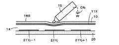 次に、第1の導体11Xを形成した上側基板10と、第2の導体21Yを形成した下側基板20との間の距離dの隙間に、硬化前の液体の状態のOCR16を流入させる(図19(B)参照)。そして、上側基板10の周部と下側基板20の周部とを、上側基板10の周部と下側基板20の周部とが所定の距離dだけ隔てられるように枠形状の張り合わせ部材を介して張り合わせて、上側基板10と、下側基板20との間の距離dの隙間に、OCR16を封止する。Next, theOCR 16 in a liquid state before curing is caused to flow into a gap having a distance d between theupper substrate 10 on which thefirst conductor 11X is formed and thelower substrate 20 on which thesecond conductor 21Y is formed ( (See FIG. 19B). Then, a frame-shaped bonding member is provided so that the peripheral portion of theupper substrate 10 and the peripheral portion of thelower substrate 20 are separated by a predetermined distance d from the peripheral portion of theupper substrate 10 and the peripheral portion of thelower substrate 20. TheOCR 16 is sealed in a gap having a distance d between theupper substrate 10 and thelower substrate 20.