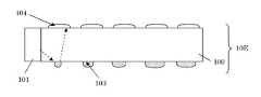 一方、導光板基材シート100の、端面から入射される光が出射する出射面上に直接、量子ドットパターン104が複数配置されている。なお本発明において、量子ドットパターンがある面に直接配置されている、ある面に直接存在しているとは、基材フィルムや接着層を介さずに、量子ドットパターンが、その面に直接形成されていることをいうものとする。On the other hand, a plurality ofquantum dot patterns 104 are arranged directly on the exit surface of the light guideplate substrate sheet 100 from which light incident from the end face exits. In the present invention, the quantum dot pattern is directly disposed on a certain surface, and is directly present on a certain surface. The quantum dot pattern is directly formed on the surface without using a base film or an adhesive layer. It is said to have been done.