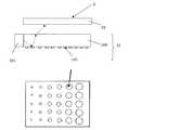 On the other hand, in thelight guide plate 10E shown in FIG. 5, the diffuse reflection pattern on the back surface is formed smaller as it approaches the light source and larger as it approaches the anti-light source. On the other hand, the quantum dot patterns on the light exit surface are all formed in the same size. Then, the occupied area ratio of the quantum dot pattern on the light emitting surface (the occupied area ratio is calculated by “(total area of pattern ÷ total area of surface on which pattern is formed) × 100”). Is larger than the area occupied by the diffuse reflection dot pattern.