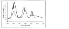 図8、図9は、本発明の一態様にかかるバックライトユニットによる色純度の改善の説明図である。導光板への入射光源として、白色LED(W-LED)(青色光LEDとY(黄色光)蛍光体を用いた場合について、その構成等を、図8、図9に基づき説明する。図8に示す例では、導光板の量子ドットパターンは、赤色光を発光する量子ドット(A)と、緑色光を発光する量子ドット(B)と、から形成されている。これら量子ドットは、青色光により励起されることで、上記各色の光を発光する。従って、導光板から出射される光のスペクトルは、図8に示すように緑色光と赤色光の波長領域にもピークが発生し、結果として色純度が改善されることになる。入射光が青色光、緑色光にピークを持つ光源(青色光(B-)LED、緑色光(G-)LED等)の場合には、量子ドットとしては、基本的には、赤色光を発光する量子ドット(A)を用いればよい。これにより、図9に示すように、赤色光の波長領域にもピークが発生し、色純度が改善される。このように、光源種と、光源種に応じた発光特性を有する適切な量子ドットを適宜組み合わせることで、色純度を改善することができる。8 and 9 are explanatory diagrams of improvement in color purity by the backlight unit according to one embodiment of the present invention. In the case of using a white LED (W-LED) (blue light LED and Y (yellow light) phosphor) as an incident light source to the light guide plate, the configuration and the like will be described with reference to FIGS. In the example shown in FIG. 4, the quantum dot pattern of the light guide plate is formed of quantum dots (A) that emit red light and quantum dots (B) that emit green light, which are blue light. As a result, the spectrum of the light emitted from the light guide plate also peaks in the wavelength regions of green light and red light as shown in FIG. In the case where the incident light is a light source having a peak in blue light or green light (blue light (B-) LED, green light (G-) LED, etc.), Basically, quantum dots that emit red light As a result, a peak is also generated in the wavelength region of red light and color purity is improved as shown in Fig. 9. Thus, the light source type and the light emission corresponding to the light source type are used. Color purity can be improved by appropriately combining appropriate quantum dots having characteristics.