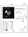 画像表示領域503は、血管の血管軸の平行な面での断面画像を表示する領域である。この画像表示領域503には、その位置がユーザの操作で自由に変更可能なマーカ504が設けられる。このマーカ504は血管の長手方向の位置を示すためのものであり、そのマーカ504が指し示す位置には線分505が表示される。この線分505は、血管軸に直交する平面を表現するものである。先に説明した画像表示領域501、502に表示される断面画像は、この線分505が表す平面での断面画像である。Theimage display area 503 is an area for displaying a cross-sectional image on a plane parallel to the blood vessel axis of the blood vessel. Theimage display area 503 is provided with amarker 504 whose position can be freely changed by a user operation. Thismarker 504 is for indicating the position in the longitudinal direction of the blood vessel, and aline segment 505 is displayed at the position indicated by themarker 504. Thisline segment 505 represents a plane orthogonal to the blood vessel axis. The cross-sectional images displayed in theimage display areas 501 and 502 described above are cross-sectional images on the plane represented by theline segment 505.