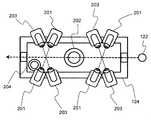 本実施の形態が第1の実施の形態と相違する点は、第一及び第三洗浄液をそれぞれ分注ノズル122の両側からかけるように構成した点である。第1の実施の形態では第一及び第三洗浄液吐出口201,203の各数量について特に触れなかった。第一洗浄液吐出口201は1つでも良いが、本実施の形態のように分注ノズル122の軌道を挟んで2つ対向して配置する構成とすることもできる。つまり、2つの第一洗浄液吐出口201から吐出する第一洗浄液が第一洗浄位置辺りで衝突するように調整することにより、第一洗浄位置にある分注ノズル122に対して、2つの第一洗浄液吐出口201によって正対する二方向から第一洗浄液がかかる構成である。また、分注ノズル122の移動を妨げない限りにおいては、第一洗浄液吐出口201を3つ以上にしても良い。これらの点については第三洗浄液吐出口203についても同様である。すなわち、第一及び第三洗浄液吐出口201,203は1つでも良いが、少なくとも一方を複数とすることもできる。その他の点について、本実施の形態は第1の実施の形態と同様である。The difference between the present embodiment and the first embodiment is that the first and third cleaning solutions are applied from both sides of the dispensingnozzle 122, respectively. In the first embodiment, the numbers of the first and thirdcleaning solution outlets 201 and 203 are not particularly mentioned. Although the number of the first cleaningliquid discharge ports 201 may be one, it may be configured so as to be disposed so as to be opposed to each other across the track of the dispensingnozzle 122 as in the present embodiment. That is, by adjusting the first cleaning liquid discharged from the two first cleaningliquid discharge ports 201 to collide around the first cleaning position, the two first cleaning liquid with respect to the dispensingnozzle 122 in the first cleaning position can be adjusted. The first cleaning liquid is applied from two directions which are directly opposite each other by the cleaningliquid discharge port 201. Further, as long as the movement of the dispensingnozzle 122 is not hindered, the number of first cleaningsolution discharge ports 201 may be three or more. The same applies to the thirdcleaning solution outlet 203 with respect to these points. That is, although the number of the first and thirdcleaning solution outlets 201 and 203 may be one, at least one may be plural. In the other points, the present embodiment is the same as the first embodiment.