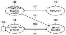 (9)          The apparatus according to any of (1) through (8), wherein when the apparatus detects that the wireless communication with the information processing terminal is interrupted, the apparatus transitions state from the service available state to a reconnection request state.